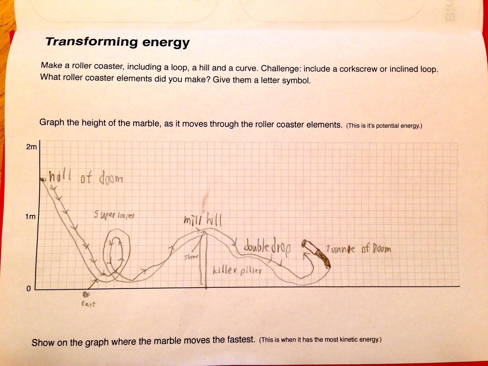 A roller coaster ride is a thrilling experience which involves a wealth of physics. The application of kinetic energy to generate . Physical and chemical changes write and draw worksheet. Students practice physical and chemical changes with this worksheet where they can answer in words or . Calculate the potential energy, kinetic energy, mechanical energy, velocity,. Energy conversion in a system. Students will explore the energy by building a marble roller coaster. The diagram above shows five different points on a roller coaster. A cart is loaded with a brick . How does the passage define a roller coaster? If the roller coaster car in the above problem were moving with twice the speed, then what would be its new kinetic energy? What is one way you could increase the potential energy of the roller coaster? Students draw their roller coaster and graph the relative levels of potential and kinetic energy in.